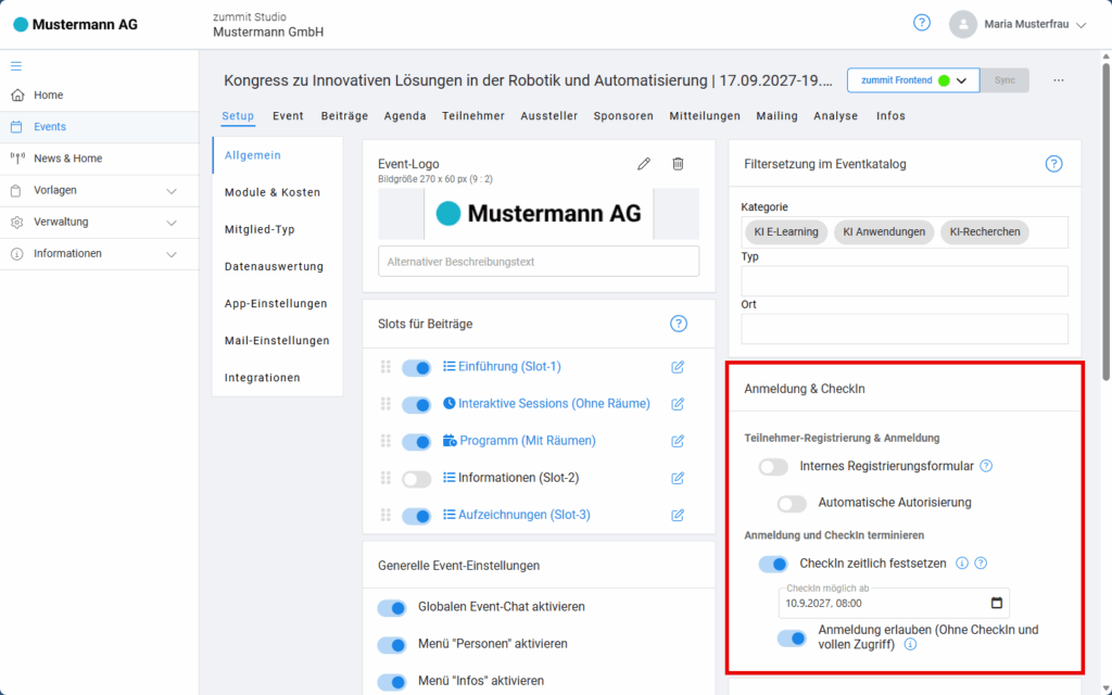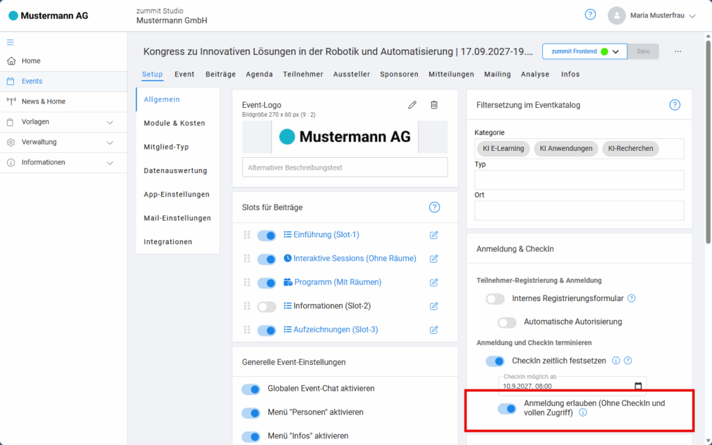 Aktivieren Sie diesen Schalter, um Ihren Stand-Besitzern und Referenten die Anmeldung während des festgesetzten CheckIn-Zeitraums zu erlauben. Dadurch können Sie im Vorfeld des Events ihr eigene Dashboard pflegen.