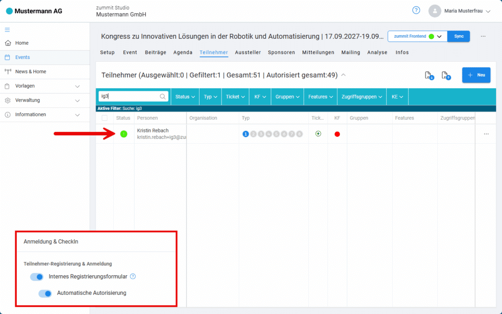 Aktivieren Sie die Funktion Automatische Autorisierung, führt jede Anmeldung über das Registrierungsformular zum Status autorisiert und Zugang zum Event.