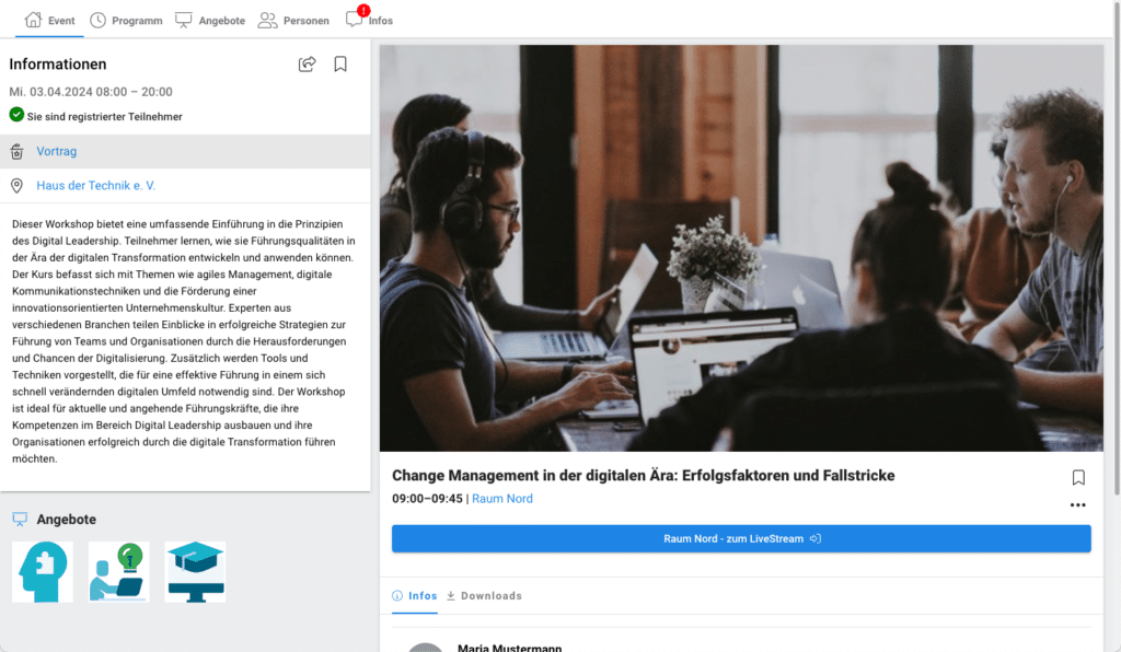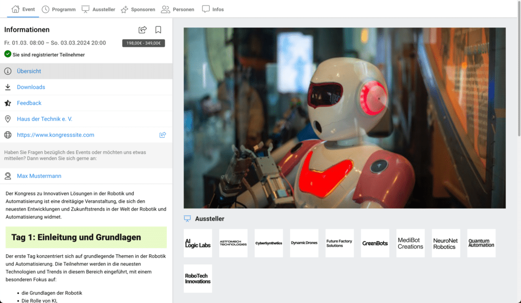 Das Standard Event ist ideal, wenn Sie ein vielseitiges Programm planen. Mit einer zentralen Startseite und einer detaillierten Agenda bietet dieses Format eine klare Struktur und Übersicht über alle Sessions.