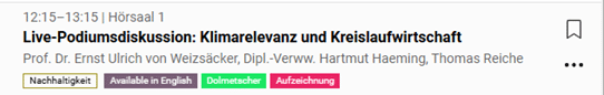 - Gruppen sind farbig umrandet und dienen dazu, Vorträge thematisch zu gliedern, z. B. in Kategorien wie (Nachhaltigkeit, Wirtschaft oder Industrie)