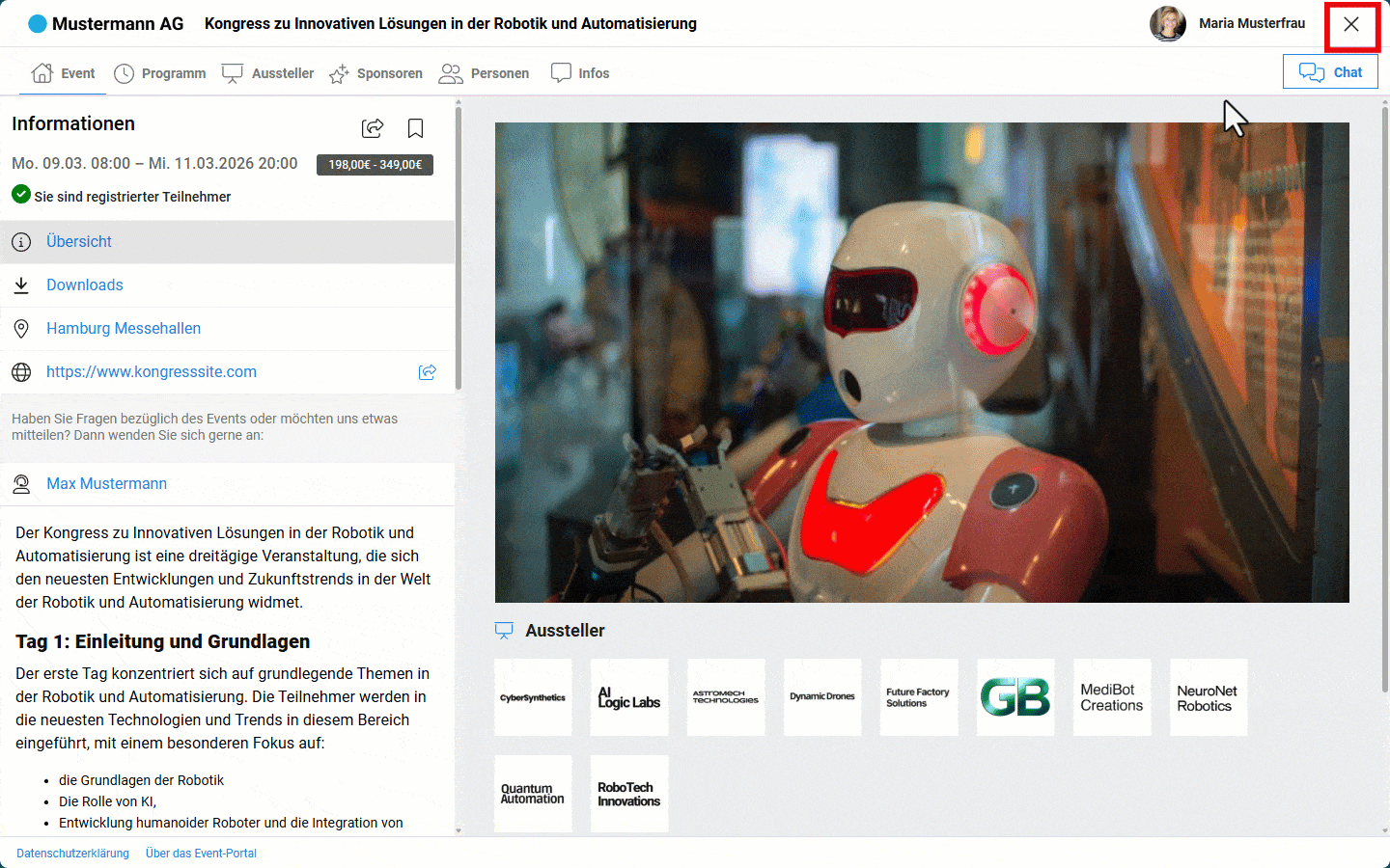 Mit Aktivieren des Switchs stellen Sie im Frontend die Möglichkeit zur Verfügung, das Event per Druck auf den Button zu schließen. Teilnehmende werden auf ihren Eventkatalog weitergeleitet.