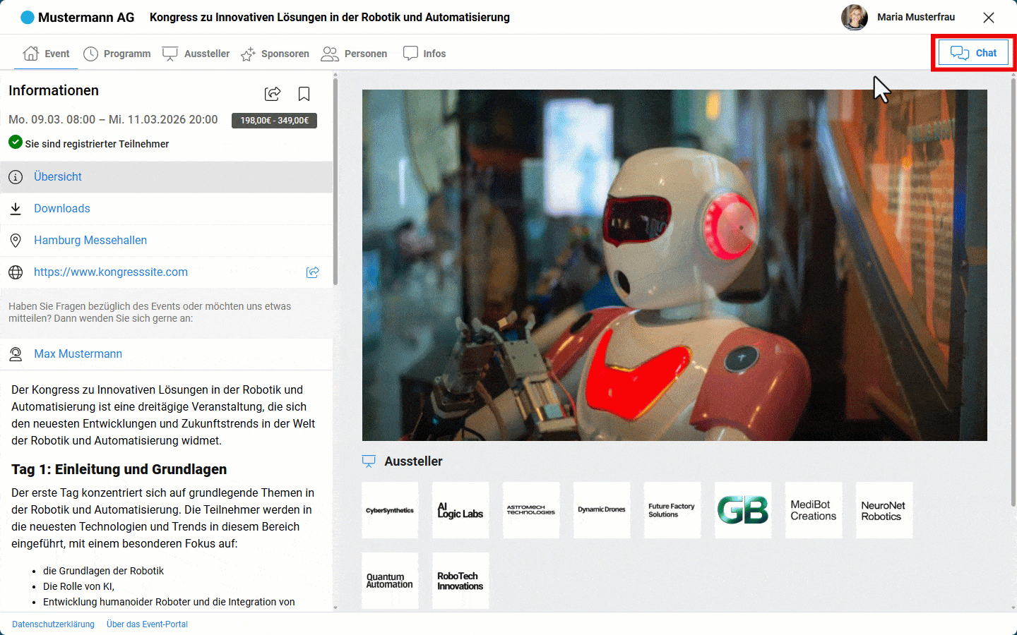 Mit Aktivieren des Switchs stellen Sie im Frontend den globalen Chat zur Verfügung. Dieser ist von jedem Teilnehmer jederzeit erreich- und einsehbar.
