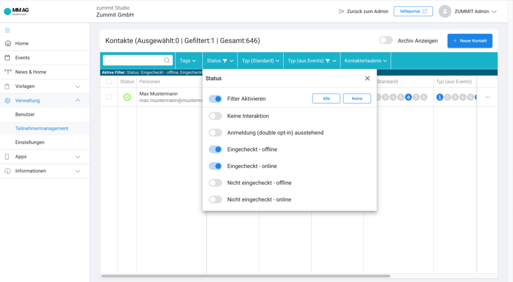 - Eingecheckt (offline/online): Teilnehmer, die sich für das Event eingecheckt haben.