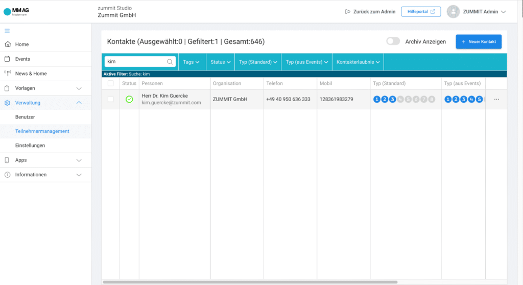 - Neue Teilnehmer können über die Schaltfläche „+ Neuer Kontakt“ hinzugefügt werden. Dies kann manuell erfolgen, wenn sich z. B. Teilnehmer außerhalb der Standardregistrierung anmelden oder intern hinzugefügt werden sollen.