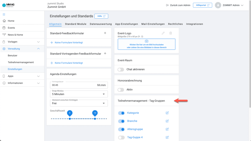 - Tag-Gruppen definieren: Um Tags oder Tag-Gruppen zu definieren, gehen Sie in die „Einstellungen“ unter „Verwaltung > Einstellungen > Allgemein“. Sobald die Tag-Gruppen aktiviert wurden, erscheinen sie als Spalten und Filteroptionen im Teilnehmermanagement.
