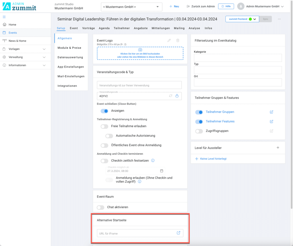 Innerhalb der „Setup„-Optionen finden Sie die Kachel „Alternative Startseite„. Hier können Sie eine externe Webseite als primäre Landing-Page für Ihr Event einbinden. Geben Sie die vollständige URL Ihrer gewünschten Startseite in das Feld ein, und achten Sie darauf, mit „https://“ zu beginnen, um Sicherheitsstandards zu erfüllen.