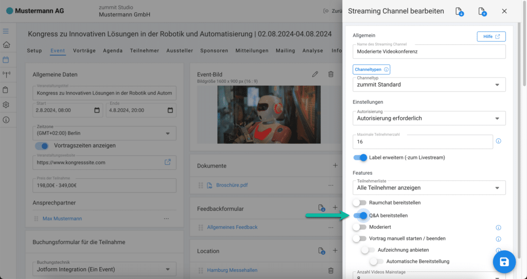 - Q&A für den gewünschten Channel aktivieren: Entscheiden Sie, ob Sie Q&A für „Videostream im Raum“, „zummit Standard“ oder „zummit InfoFrame“ aktivieren möchten. Q&A ist für alle drei Streaming-Channels verfügbar.