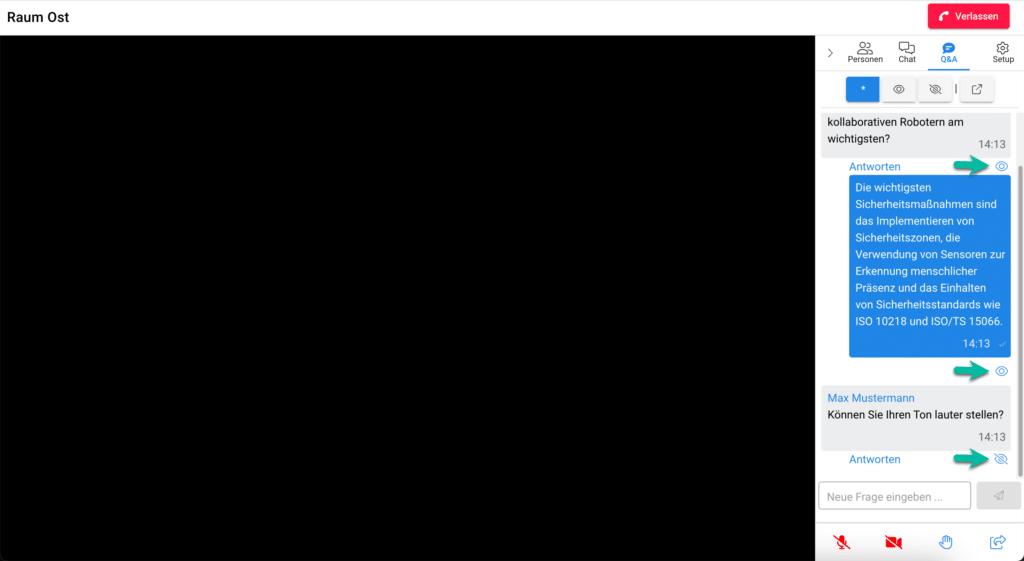 - Nur sichtbare Fragen: Klicken Sie auf das Auge-Icon in der oberen Leiste des Q&A-Fensters, um nur sichtbare Fragen anzuzeigen.
