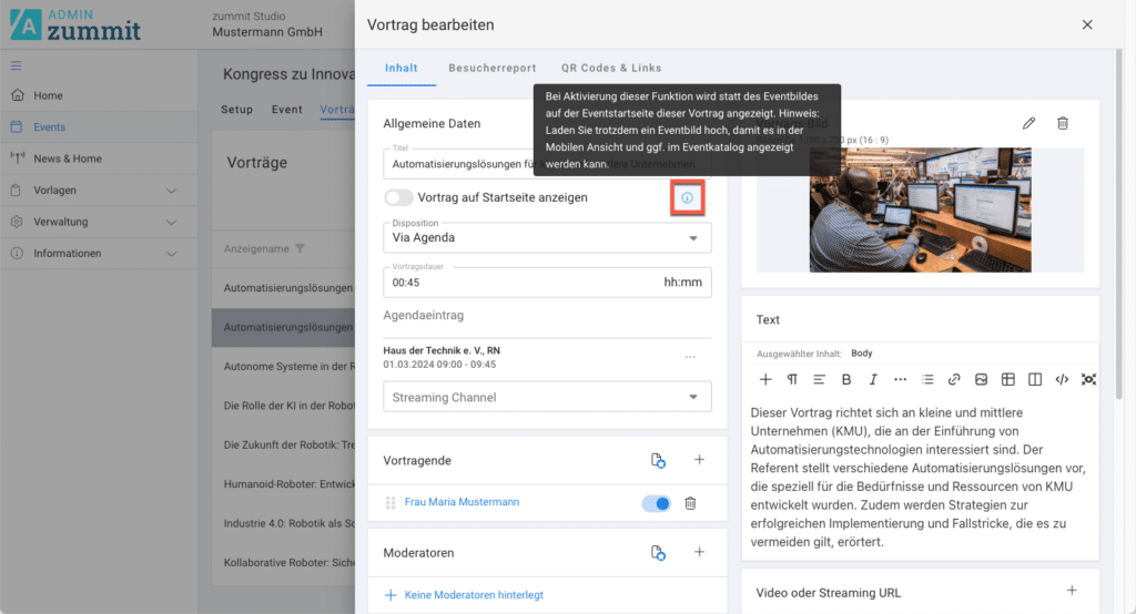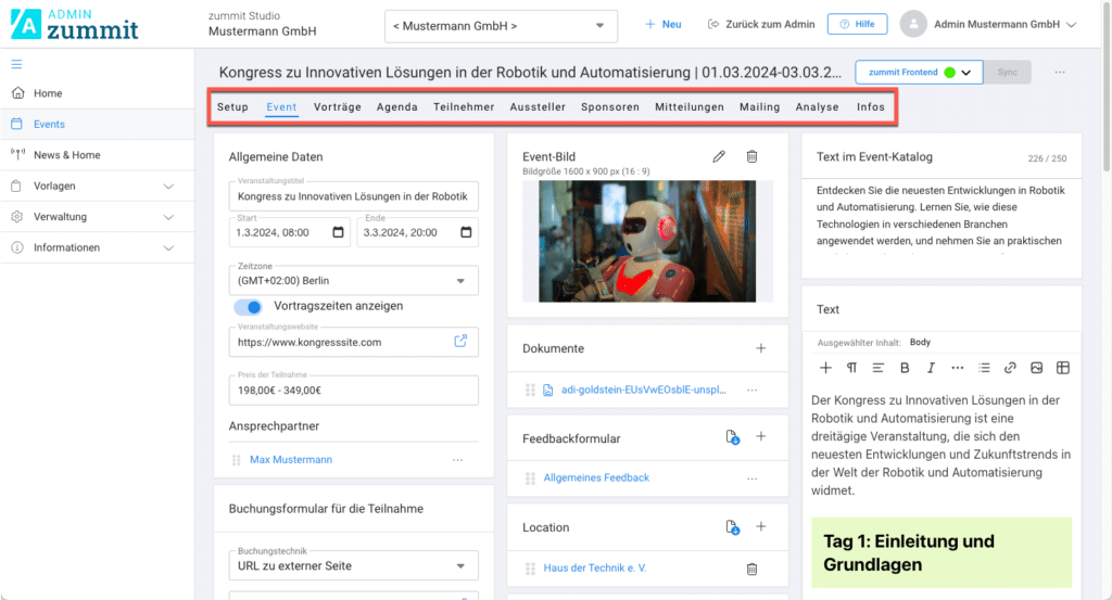 Das zummitStudio ist entworfen worden, um Ihnen eine nahtlose und intuitive Erfahrung zu bieten. Es ist die Verbindung zwischen Ihnen und einem reibungslosen Veranstaltungserlebnis. Wenn Sie irgendwo auf dem Weg Unterstützung benötigen, sind wir nur einen Klick entfernt. Viel Erfolg!